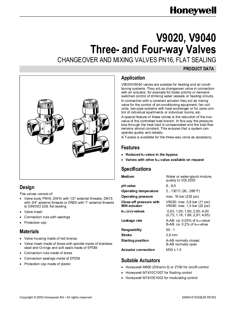Honeywell Home V9020 ventiler er velegnede til opvarmning og aircondition systemer fra Resideo. De fungerer som omskiftningsventil i forbindelse med en aktuator, for eksempel til kedelprioritet eller prioritering af varmvandsbeholder eller varmekreds. I forbindelse med en konstant aktuator fungerer de som blandeventil til styring af klimaanlæg, ventilationsanlæg, tostrengssystemer med varmeveksler eller til zonestyring af individuelle lejligheder eller individuelle værelser osv.