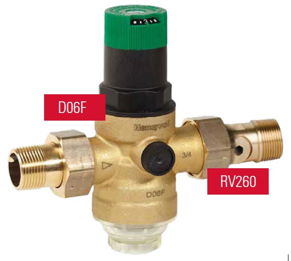 Braukmann Blyfri D06F trykreduktionsventil fra Resideo monteret med blyfri RV260 kontraventil kategori 2 fra Resideo.
