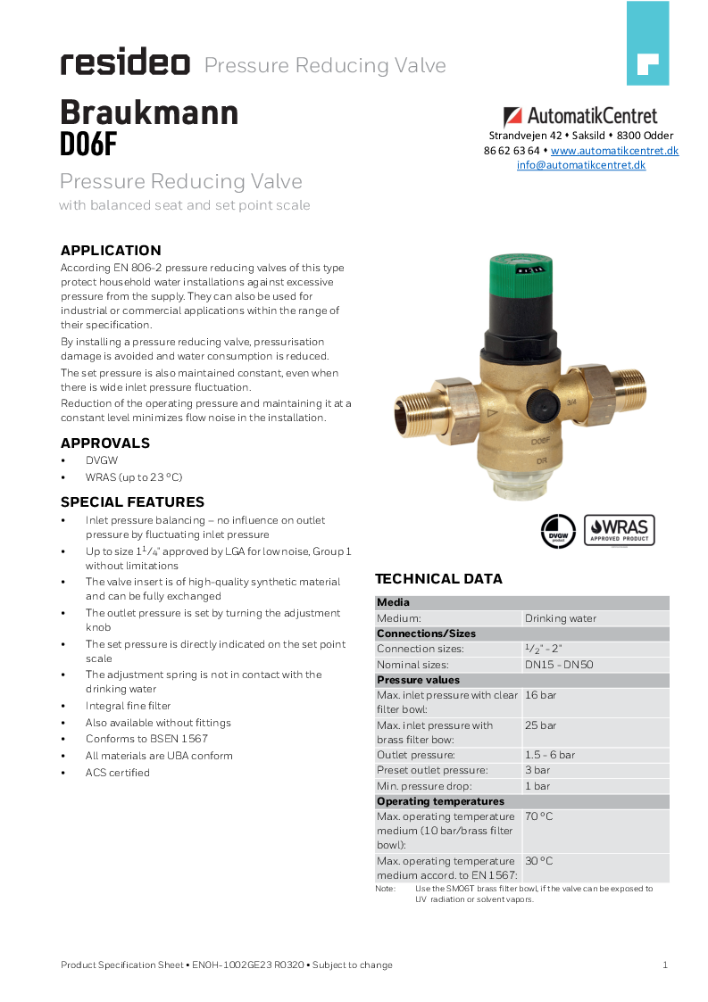 I henhold til EN 806-2 beskytter denne type Braukmann trykreduktionsventiler fra Resideo vandinstallationerne i husholdningerne mod for højt tryk fra forsyningen.