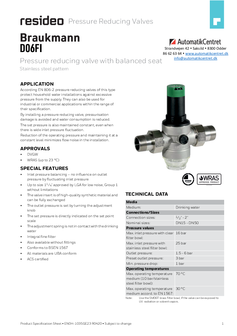 I henhold til EN 806-2 beskytter denne type Braukmann trykreduktionsventiler fra Resideo vandinstallationerne i husholdningerne mod for højt tryk fra forsyningen. De kan også i overensstemmelse med deres specifikationer bruges til industrielle eller kommercielle anvendelser. Ved montering af en trykreduktionsventil undgås skader pga. overtryk, og vandforbruget reduceres. Det indstillede tryk holdes også konstant, selv om der er store udsving i indløbstrykket. Reduktion af driftstryk og fastholdelse af det på et konstant niveau mindsker flowstøj i installationen. Tidligere Honeywell rustfri trykreduktionsventil.