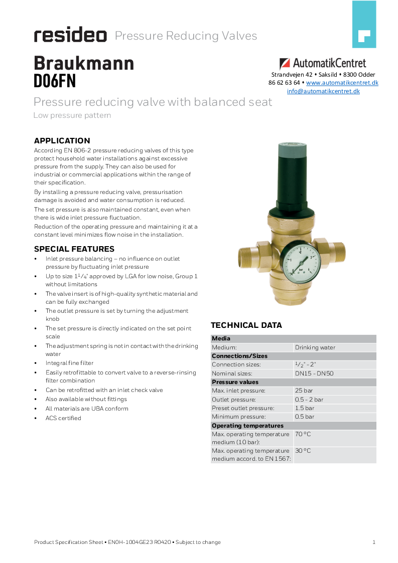 I henhold til EN 806-2 beskytter denne type Braukmann trykreduktionsventiler fra Resideo vandinstallationerne i husholdningerne mod for højt tryk fra forsyningen.