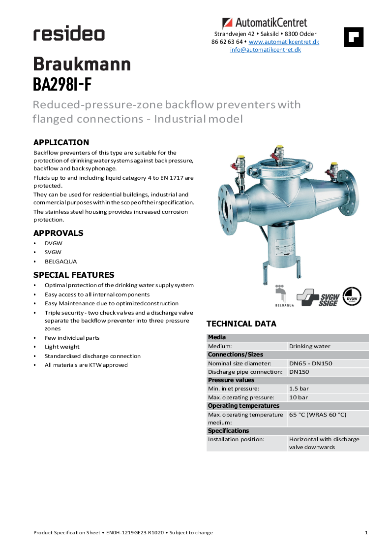 Braukmann Tilbagestrømningssikringer fra Resideo i zone med reduceret tryk med flangeforbindelser - Industrimodel