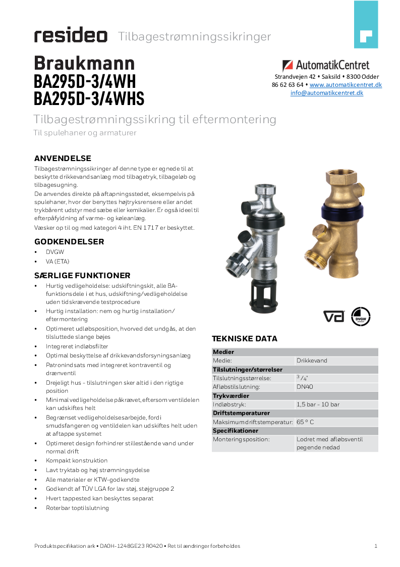 Tilbagestrømningssikring, messing | BA295D-34WHS