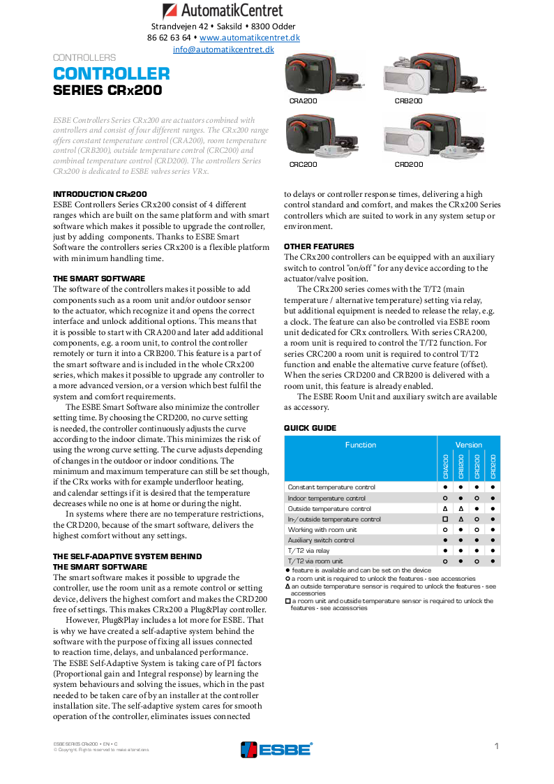 ESBE Controller Series CRx200 er motorer kombineret med controllere og består af fire forskellige serier. CRx200-serien tilbyder konstant temperaturstyring (CRA200), rumtemperaturstyring (CRB200), udetemperaturstyring (CRC200) og kombineret temperaturstyring (CRD200). Regulatorerne Serie CRx200 er dedikeret til ESBE ventiler serie VRX.