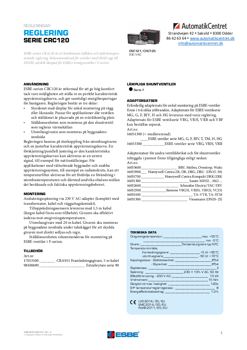 ESBEs serie CRA120 er en kombineret aktuator og vejrkompenserende regulering. Anbefales til ventiler med DN65 op til DN150, især velegnet til ESBE's trevejsventiler i F-serien. Esbe varenr.:12842100