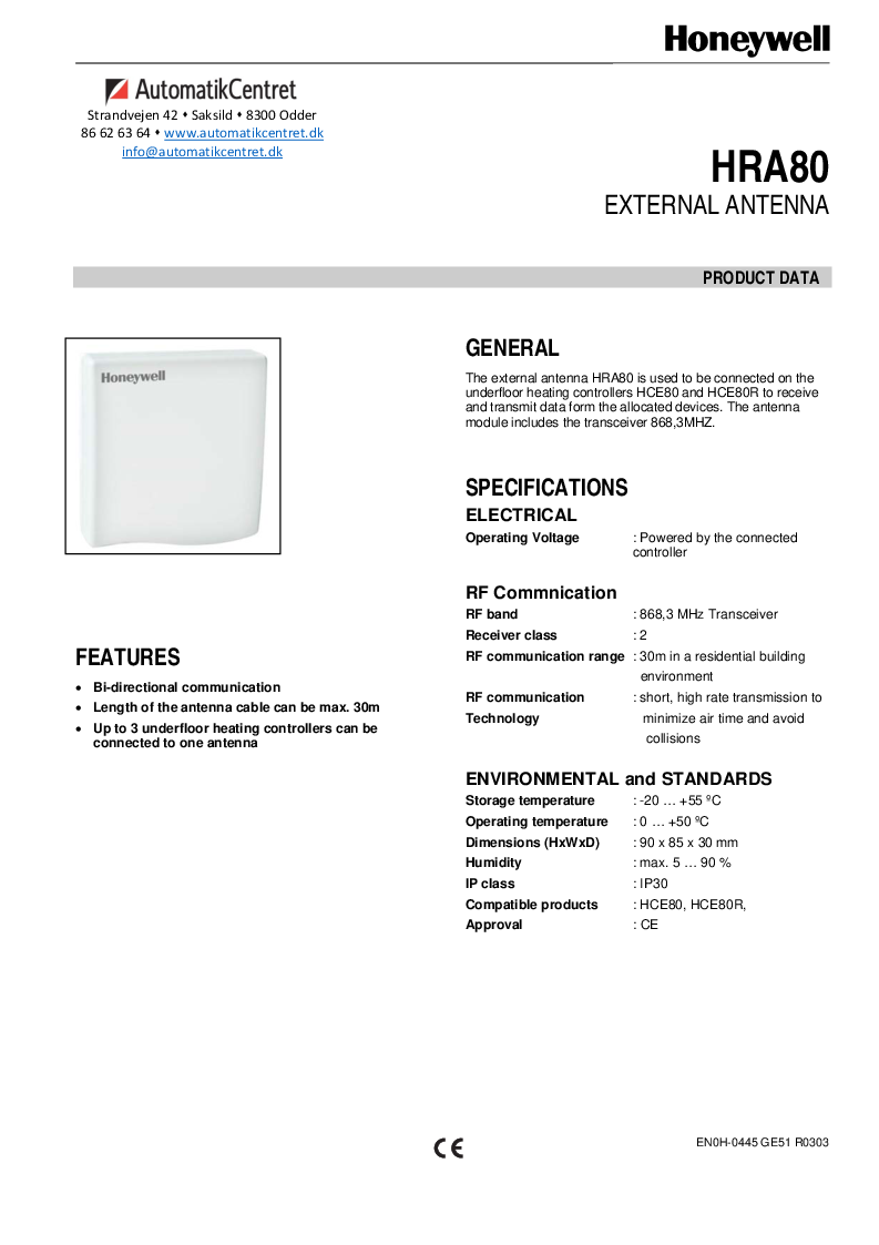 Den eksterne antenne HRA80 Honeywell Home fra Resideo bruges til at blive tilsluttet på gulvvarmecontrollerne HCE80 og HCE80R til at modtage og transmittere data fra de tildelte enheder.