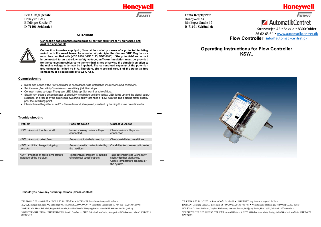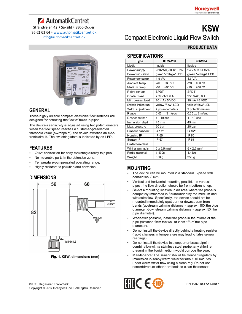 Disse meget pålidelige kompakte elektroniske flowafbrydere Honeywelle Fema er designet til at detektere strømningen af væsker i rør. Enhedens følsomhed justeres ved hjælp af to potentiometre. Når flowhastigheden rammer den indstillede værdi, skifter enheden et elektronisk kredsløb. Skiftetilstanden er indikeret med en LED.