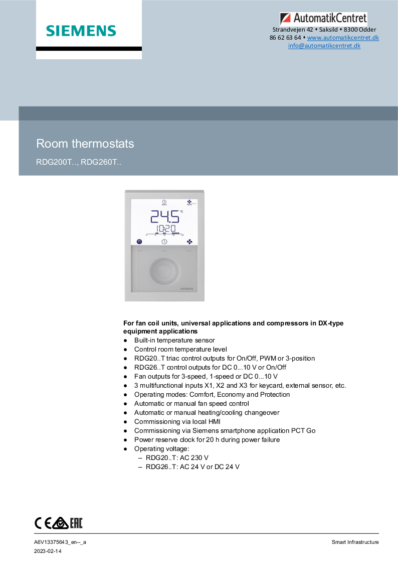 Siemens Vægmonterede rumtermostater med LCD display, Auto timer-tilstand med 8 programmerbare timere. Auto timeren kan deaktiveres. Erstatter RDG100T