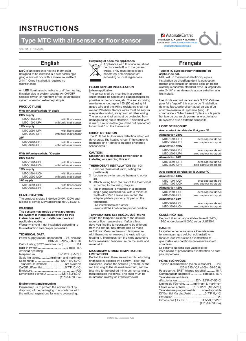 OJ Electronics MTC er en elektronisk opvarmningstermostat, der er designet til at blive installeret i en almindelig enkelt elektrisk kasse med en minimumsbredde på 2-1/4 ".