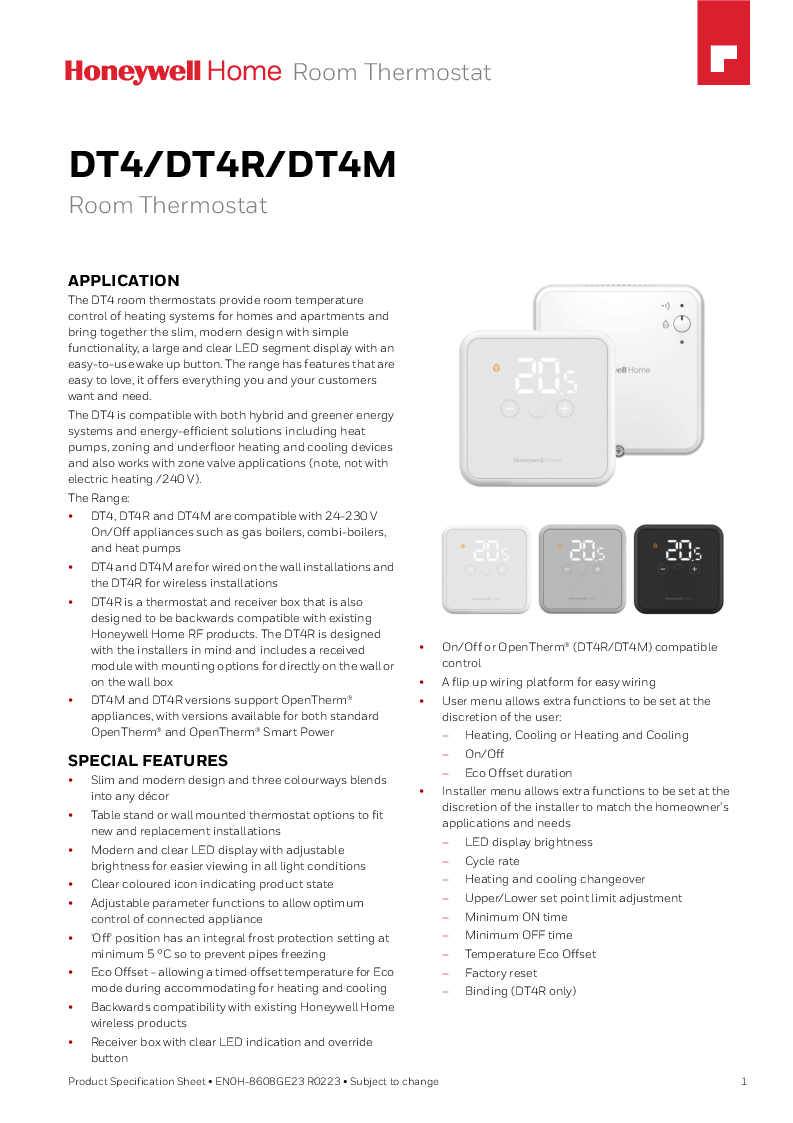 DT4 rumtermostaterne bruges til styring af varmeanlæg i boliger og lejligheder. Den hsr et moderne design og er enkel at betjene via et stort og overskueligt LED-segmentdisplay med en letanvendelig betjeningsknap. Sortimentet har funktioner, der tilbyder alt hvad der er brug for til at styre et varmeanlæg og sikre god komfort. DT4 er kompatibel med både hybrid og grønnere energisystemer og energieffektive løsninger herunder varmepumpe, zoneinddeling og gulvvarme- og køleanlæg og fungerer også med zoneventilapplikationer. DOG IKKE MED ELVARME 240V.