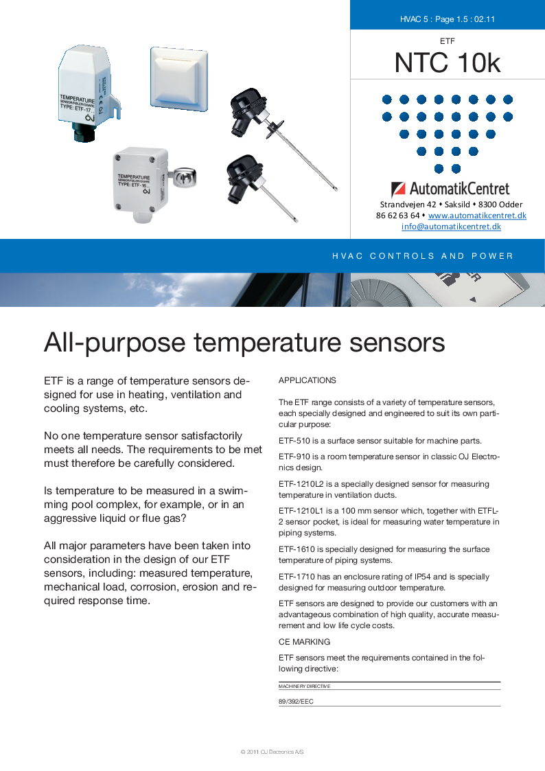 ETF OJ Electronics er en følerserie som er designet til temperaturmåling i bl.a. varme-, ventilations- og kølesystemer. Der findes ikke én temperaturføler med egenskaber som imødekommer alle faktorer. Derfor skal det nøje vægtes, hvilke faktorer, der skal opfyldes. Er det temperaturen i en svømmehal, en aggressiv væske eller røggas i en skorsten, der skal måles?