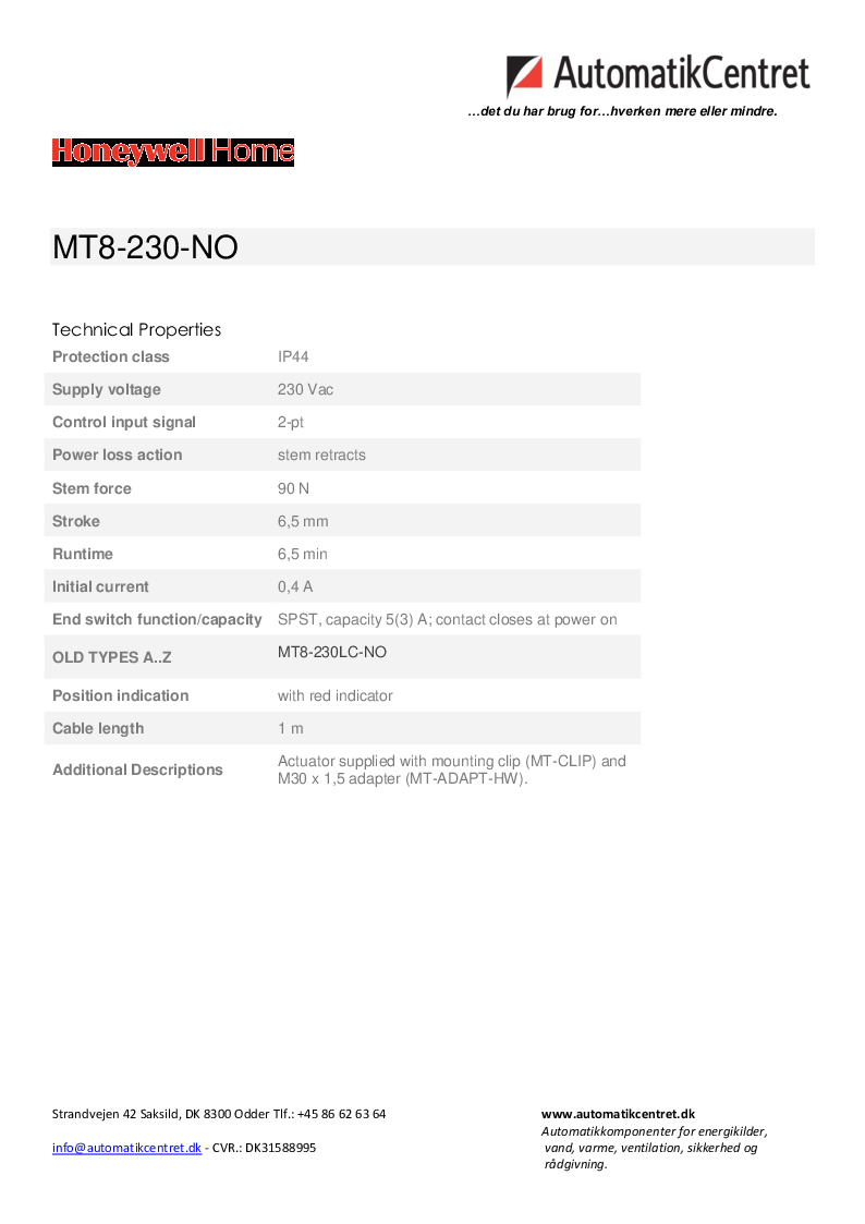 Lille termisk aktuator fra Honeywell, som bruges i rum og zone applikationer til tidsstyret topunkts- og PWM regulering af varme- og kølesystemer såsom blæserenheder, radiatorer, gulvvarmesystemer, kølet lofter og konvektorer.