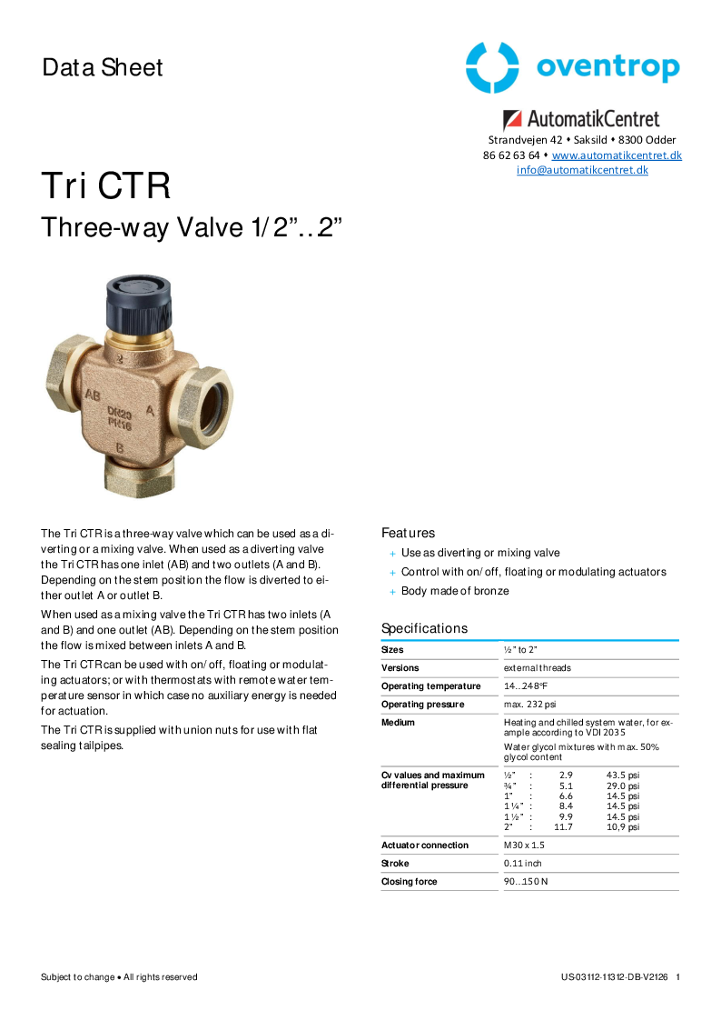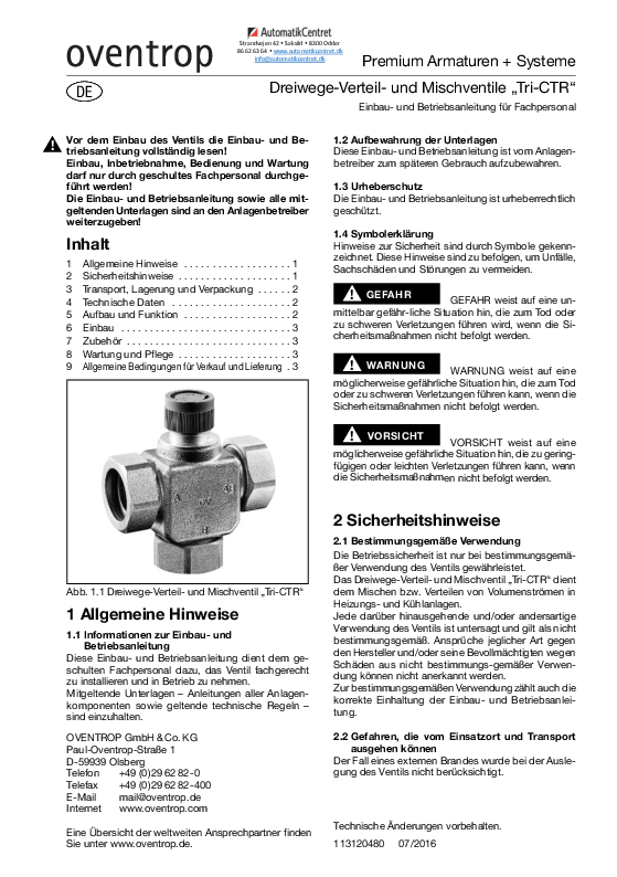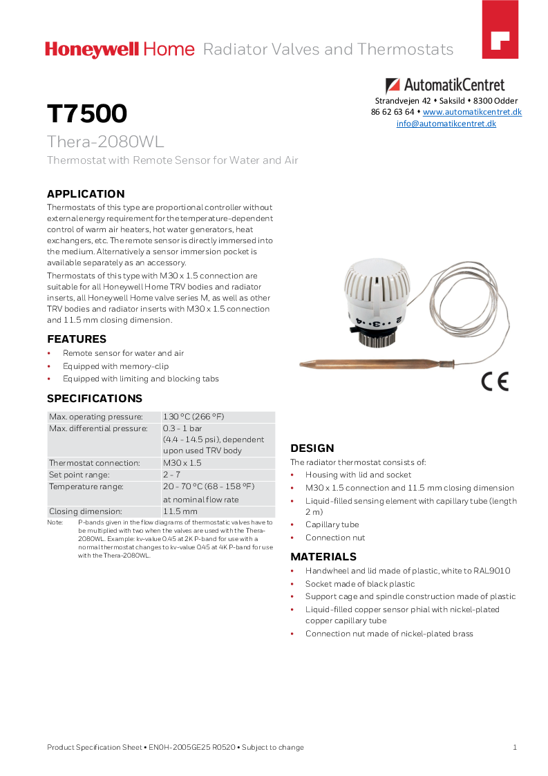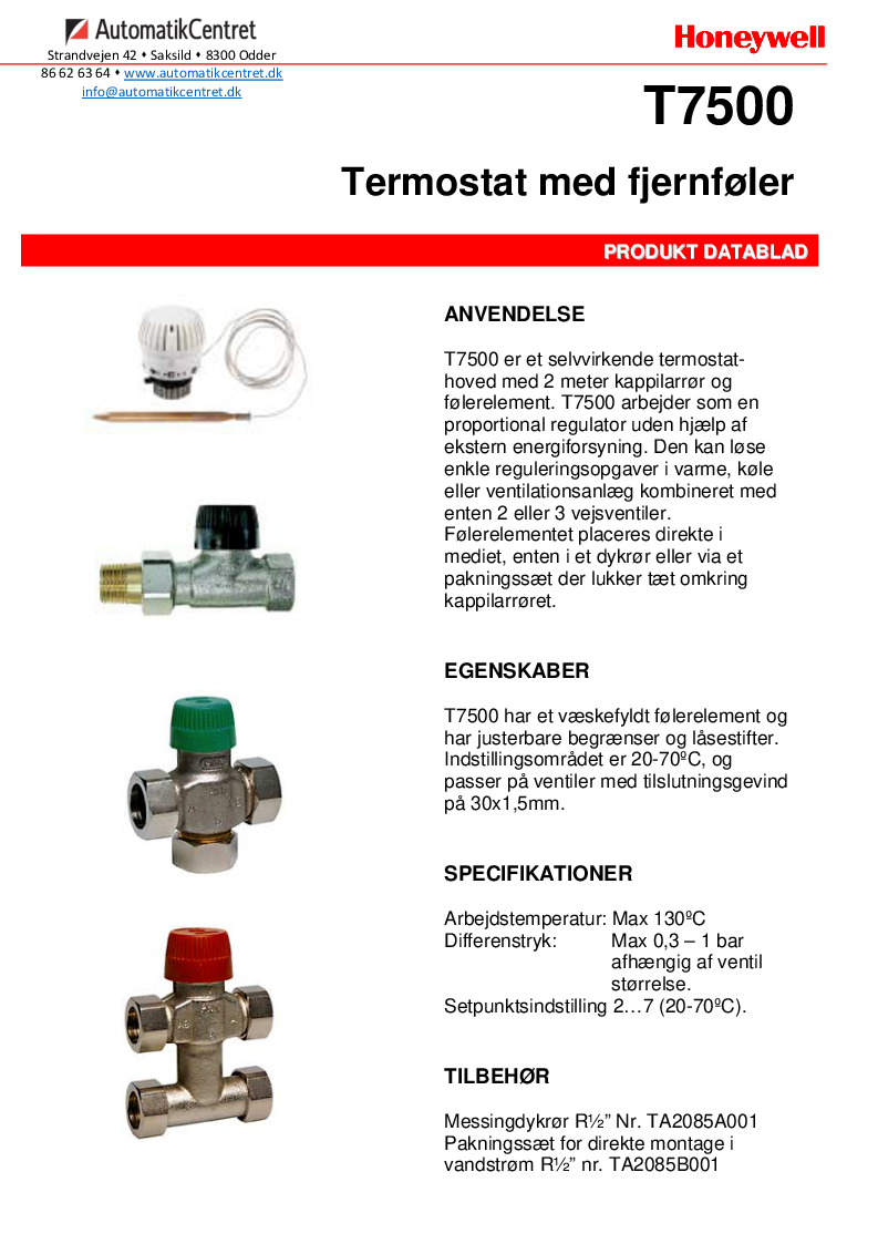 Sættet består af 3- vejs ventil fra Oventrop, Honeywell Home termostathoved med kapilarrør, omløbere, nipler og dykrør fra Resideo.