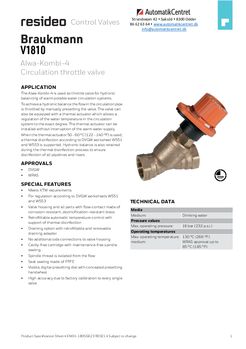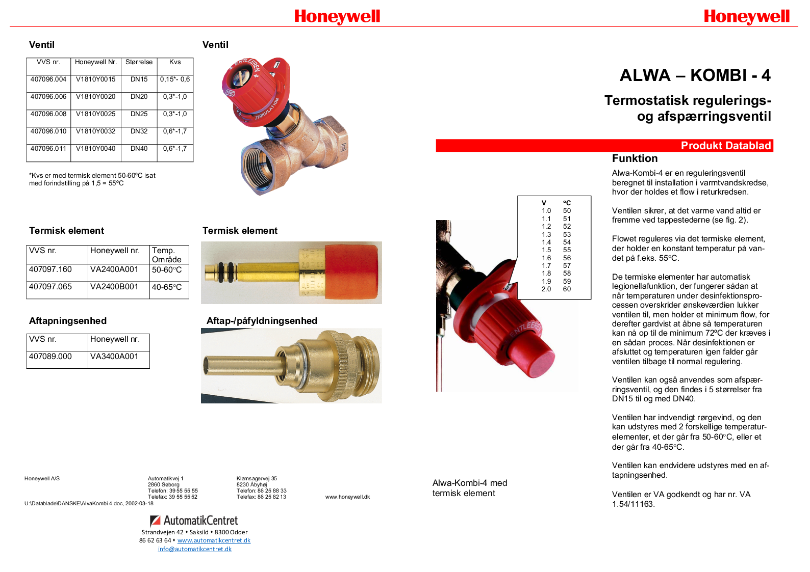 Alwa-Kombi-4 er en reguleringsventil beregnet til installation i varmtvandskredse, hvor der holdes et flow i returkredsen.