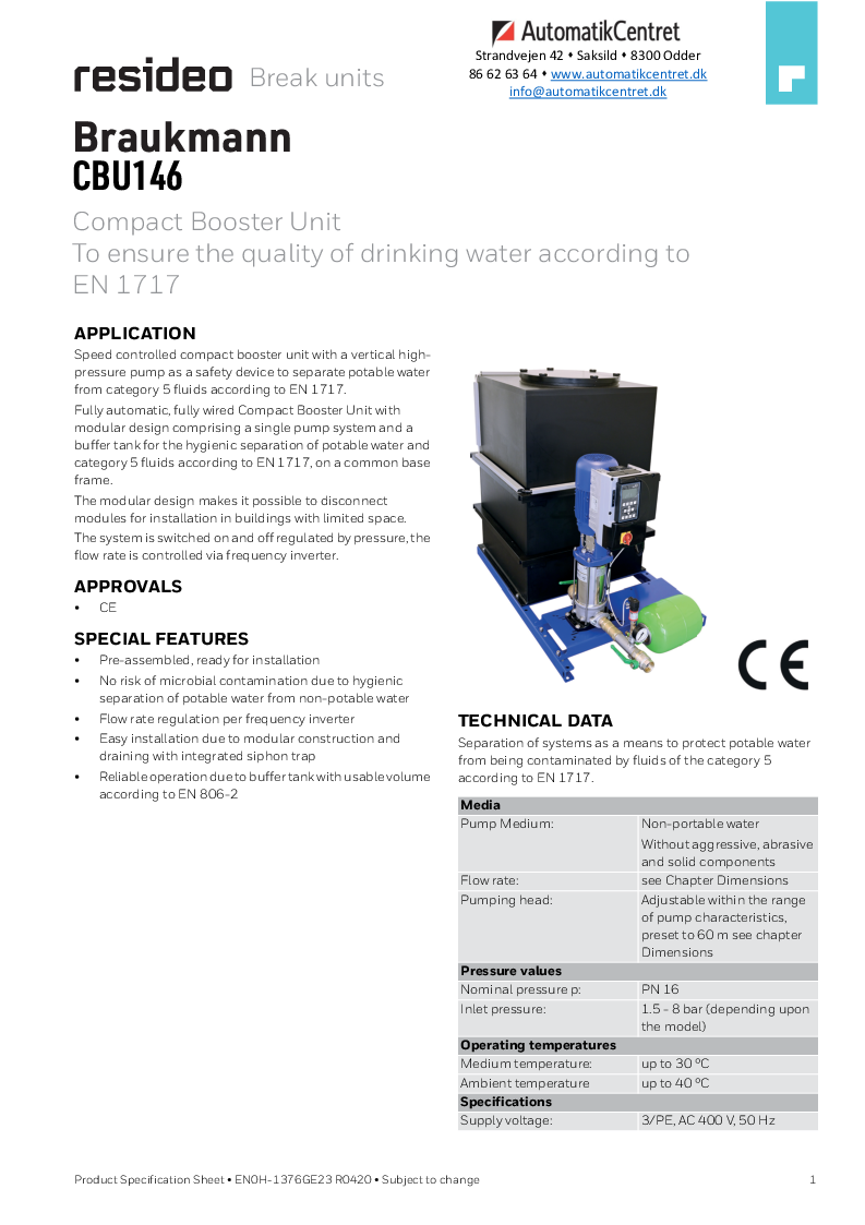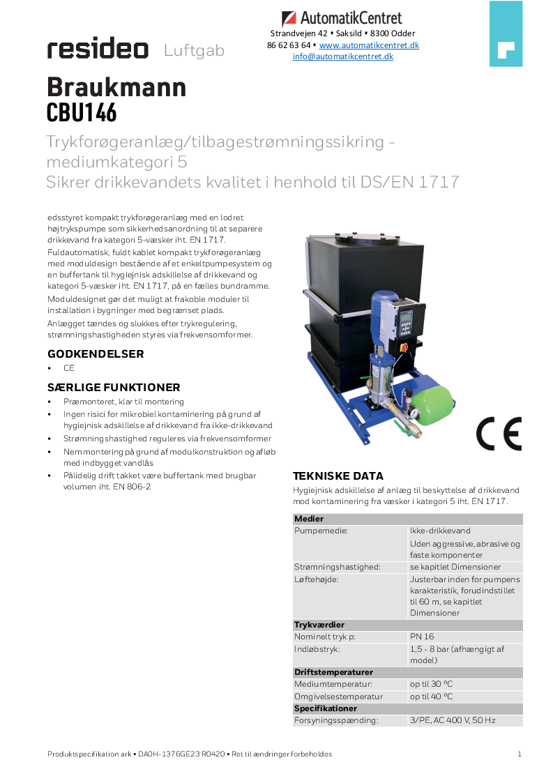 Braukmann produkt fra Resideo Trykforøgeranlæg/tilbagestrømningssikring - mediumkategori 5 Sikrer drikkevandets kvalitet i henhold til DS/EN 1717