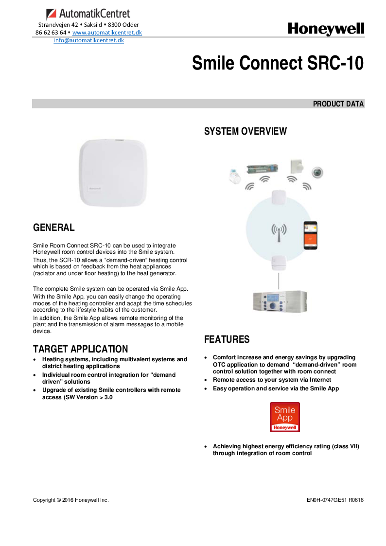 Smile Room Connect SRC-10 kan bruges til at integrere Honeywell rumstyringsenheder i Smile-systemet. SCR-10 tillader således en "efterspørgselsstyret" opvarmning, der er baseret på feedback fra varmeapparaterne (radiator og gulvvarme) til varmeregulatoren. Det komplette Smile-system kan betjenes via Smile App. Med Smile-appen kan du nemt ændre driftstilstandene til varmestyringen og tilpasse tidsplanerne i forhold til dagsmynsteret. Derudover tillader Smile App fjernovervågning af anlægget og transmission af alarmmeddelelser til en mobil enhed.