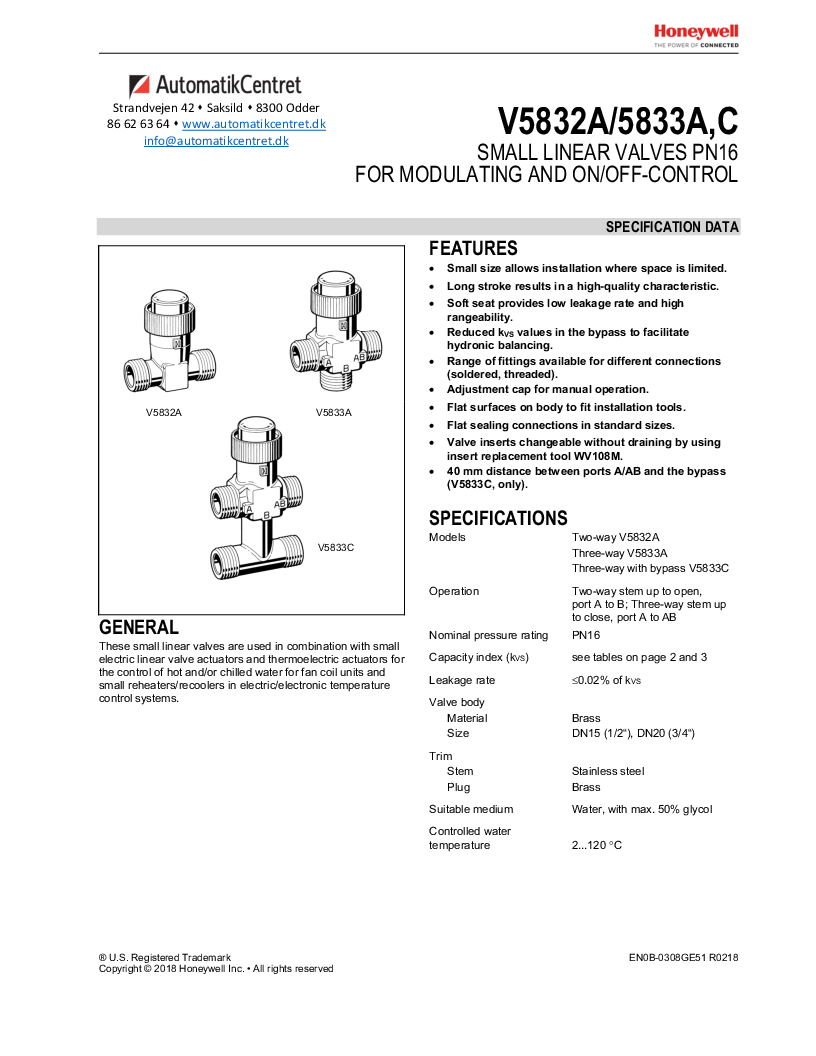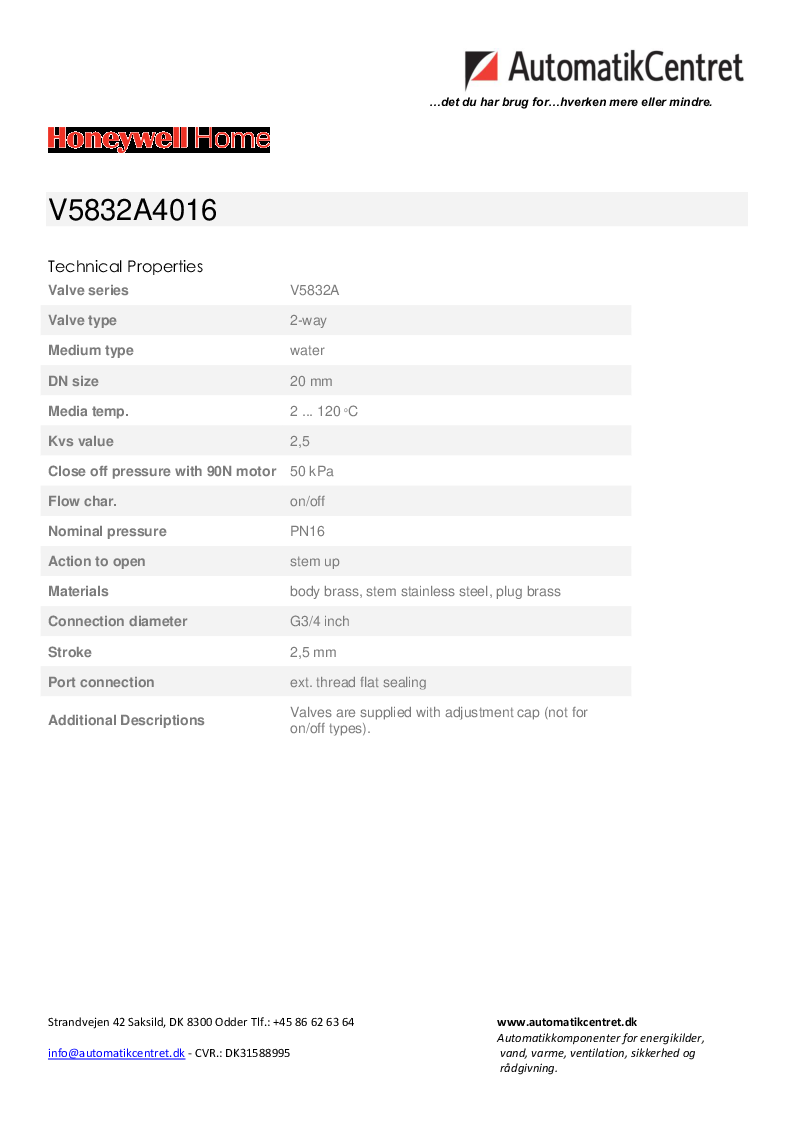 Honeywell 2-vejs ventil til individuel rumstyring, ventilatorkonvektorer og små eftervarmere/genkølere; varmt vand eller koldt vand (max. 50% glykol), vandkvalitet VDI2035.