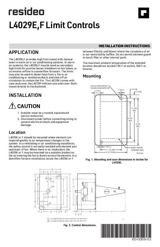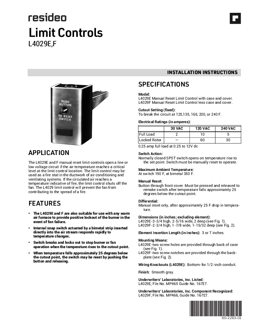 Resideo L4029E varmluft termostat åbner et lavspændingskredsløb, hvis lufttemperaturen når et kritisk niveau på termostatens placering.
