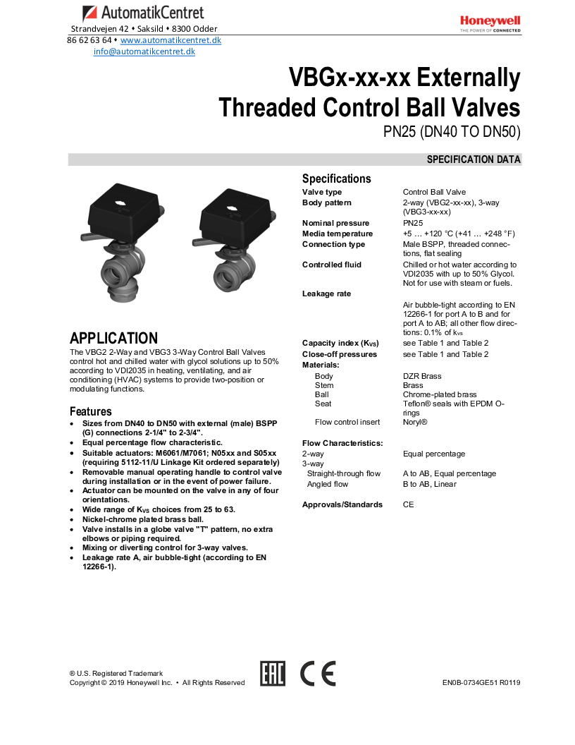 Honeywell VBG3 3-vejs kontrolkugleventiler kontroller varmt og afkølet vand med glykolopløsninger op til 50 % i henhold til VDI2035 inden for varme, ventilation og luft konditioneringssystemer (HVAC) for at give to-positions eller modulerende funktioner.