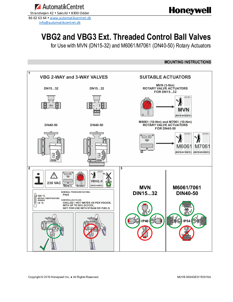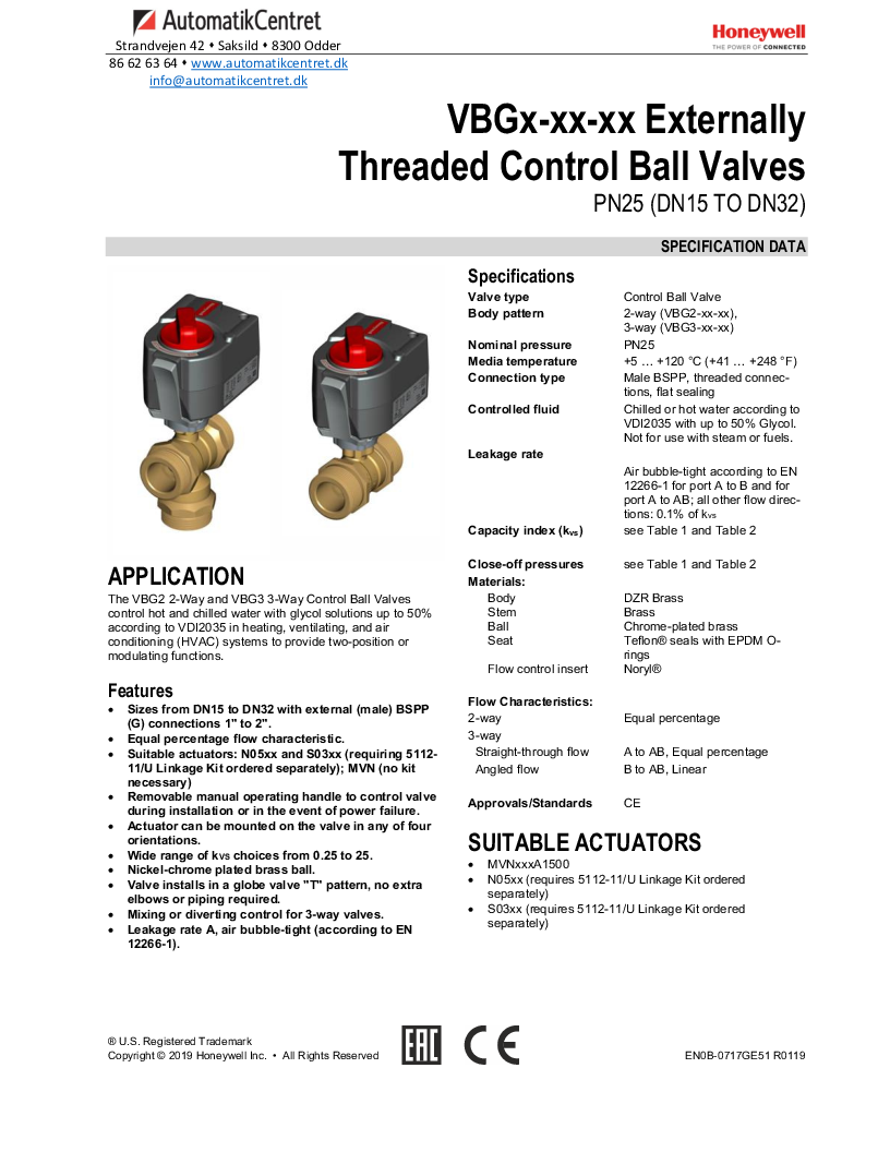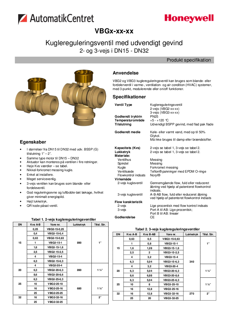 Honeywell VBG3 3-vejs kontrolkugleventiler kontroller varmt og afkølet vand med glykolopløsninger op til 50 % i henhold til VDI2035 inden for varme, ventilation og luft konditioneringssystemer (HVAC) for at give to-positions eller modulerende funktioner.